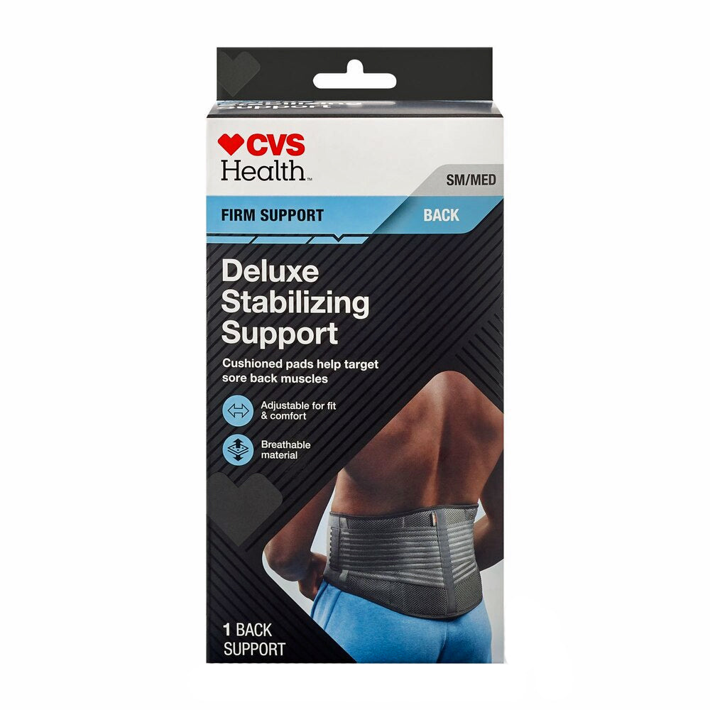 The CVS Health Firm Support Back Deluxe Stabilizing Support provides customizable compression and firm support for sore, strained or aching backs. The device features cushioned pads for targeted support. This back support also has adjustable elastic strap for a custom fit. Its breathable mesh material adds comfort for all-day wear.