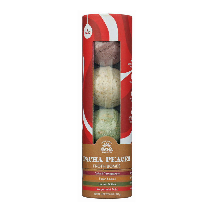 Experience a luxurious bath with the Pacha Peaces Holiday Froth Bomb Collection. Each 8 oz bomb contains Pacha Soap's signature froth formula, nourishing your skin while creating a relaxing and rejuvenating experience. Enjoy the festive holiday scents and indulge in the benefits of natural ingredients.