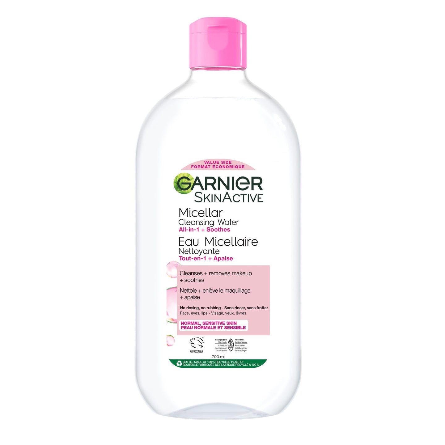 All-in-1. Removes makeup + cleanses + soothes. No rinse, no harsh rubbing face, lips, eyes. All skin types, even sensitive. No oil, alcohol, fragrance. Dermatologist tested for safety. This all-in-1 cleanser specially formulated with micellar technology effectively cleanses, removes makeup and refreshes skin. Like a magnet, micelles capture and lift away dirt, oil and makeup without harsh rubbing, leaving skin perfectly clean and refreshed without over-drying. Ophthalmologist tested. Non-comedogenic - won't clog press. garnierUSA.com. Learn more at garnierUSA.com. Question or comments? 1-800-370-1925. garnierUSA.com. Made in Canada with domestic and imported parts.