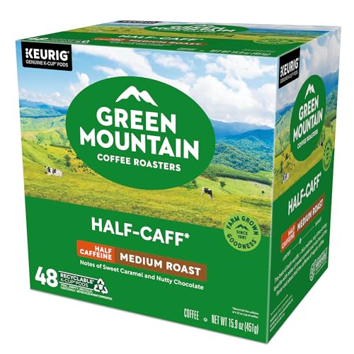 Green Mountain Coffee Roasters Half Caff delivers a balanced coffee experience with 50% less caffeine than regular blends, making it ideal for afternoon enjoyment or caffeine-sensitive drinkers. These medium roast K-Cup pods brew smooth, flavorful coffee in seconds using any Keurig brewer. Each box contains 48 individually wrapped pods, ensuring freshness and convenience for daily use. The carefully selected bean blend offers rich taste without the jitters, perfect for those seeking quality coffee with moderation in mind.