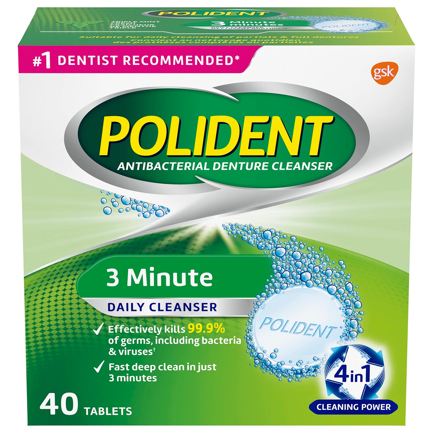 Details: Triple mint fresh in just 3 minutes. Antibacterial. Cleans tough stains. Controls denture odor. Leaves a clean feeling. Kills 99.9% of bacteria. Soak every day to keep odor away. For better odor control, use Polident every day!